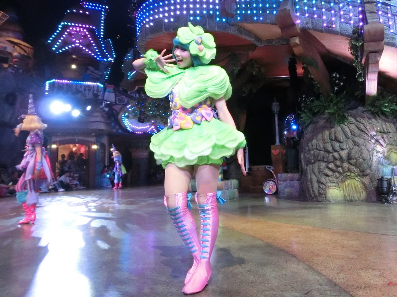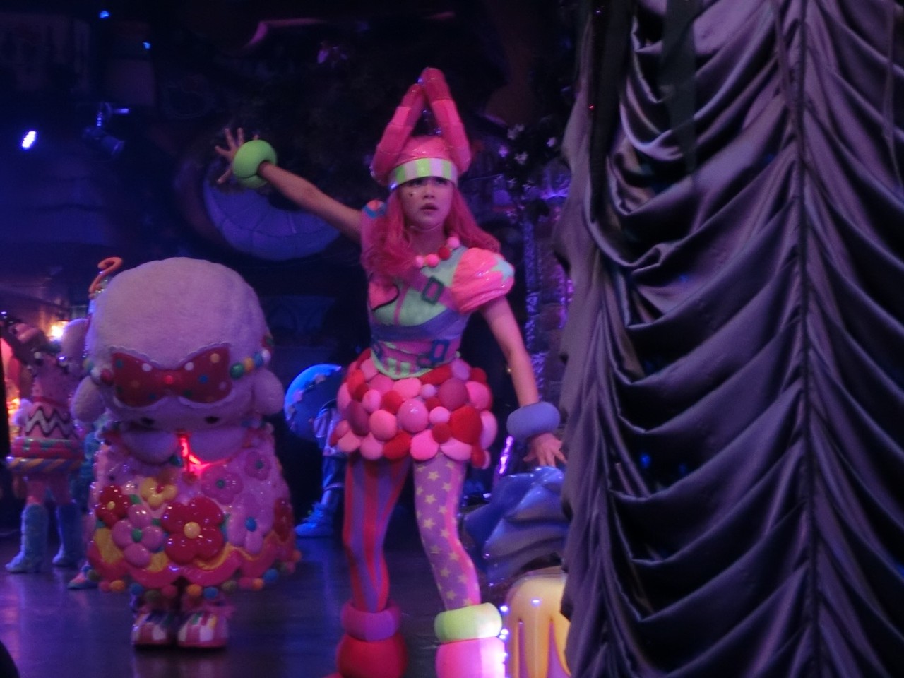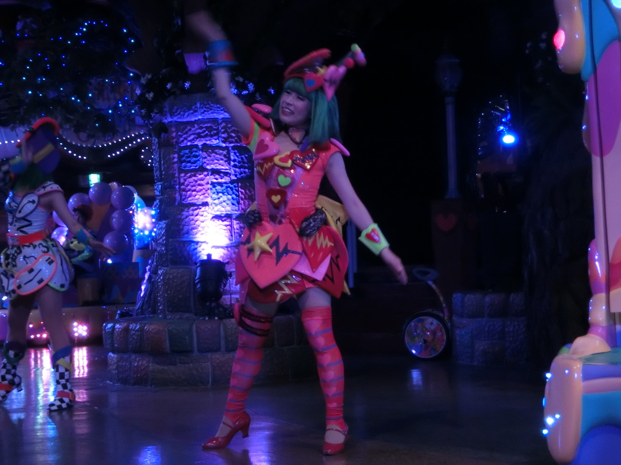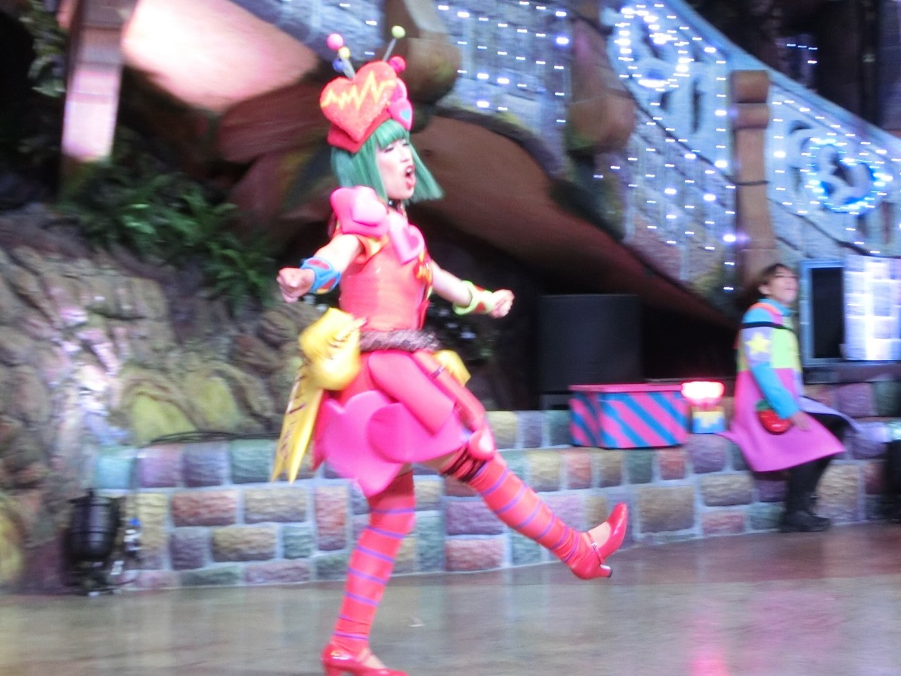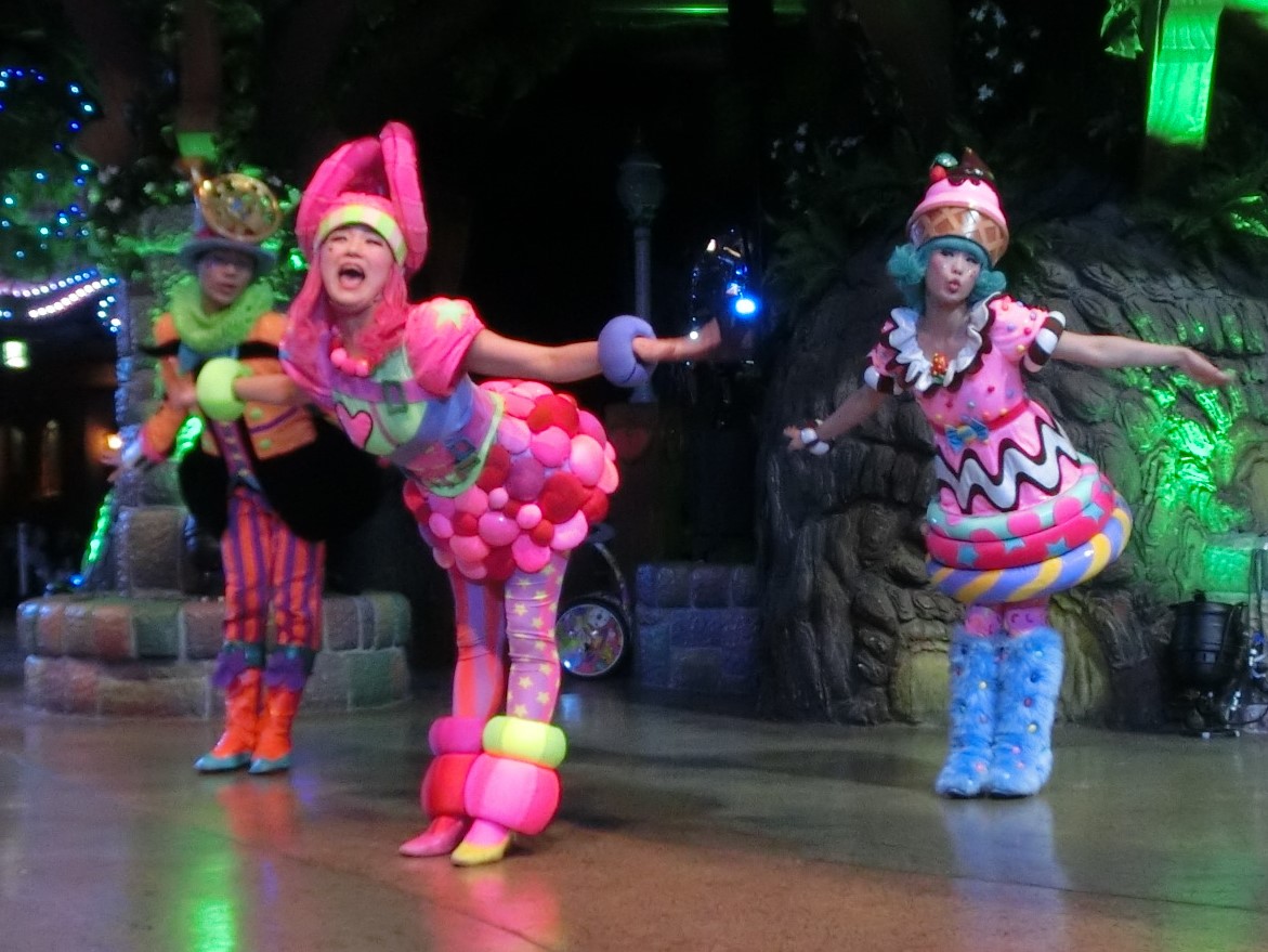一旦お昼を食べに外へ出て、帰ってきたのは13時30分過ぎ。ちょうどステージではメルのショーをやっていました。いつもはメルヘン劇場で「鬼さん」を演じている皆さんがパステルカラーのかわいい衣装でメルとショーを演じるのが見ものです。