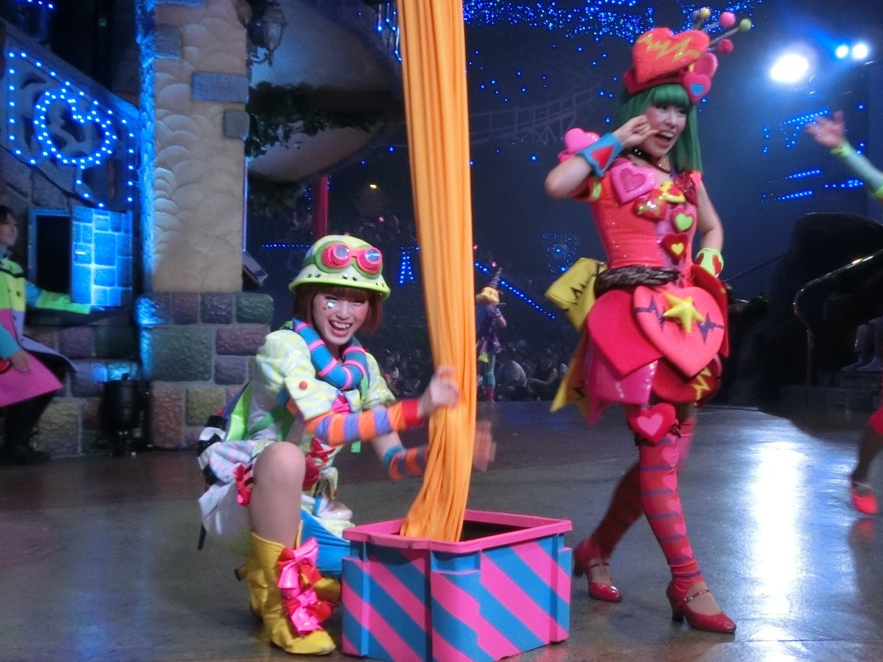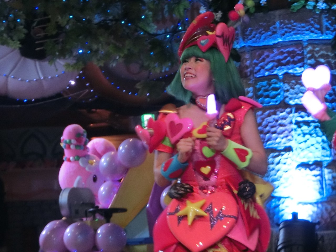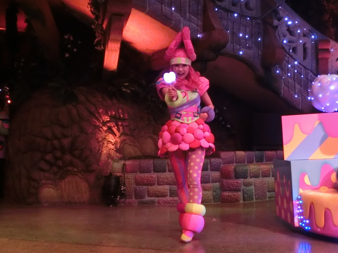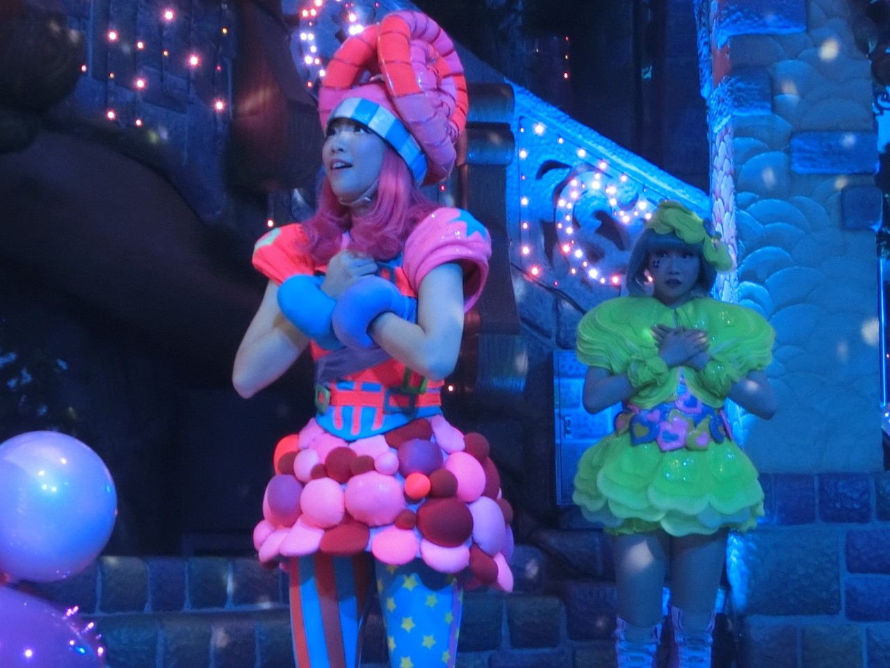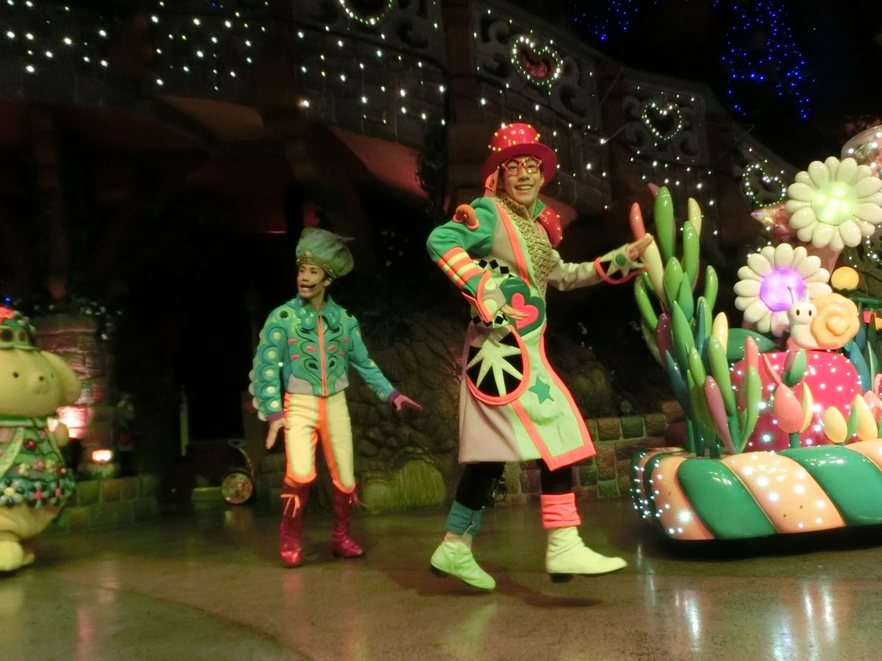 一旦お昼を食べに外へ出て、帰ってきたのは13時30分過ぎ。ちょうどステージではメルのショーをやっていました。いつもはメルヘン劇場で「鬼さん」を演じている皆さんがパステルカラーのかわいい衣装でメルとショーを演じるのが見ものです。