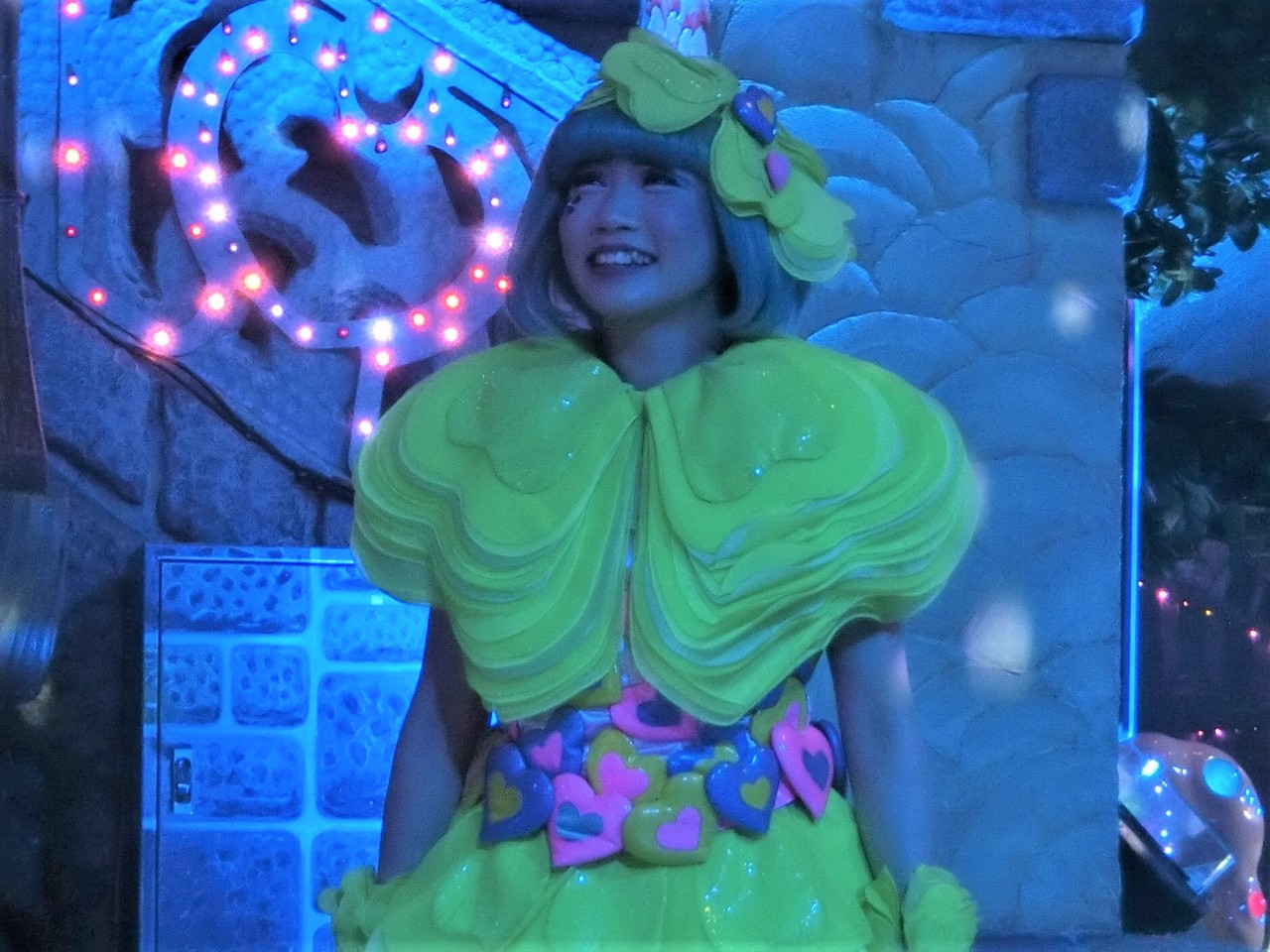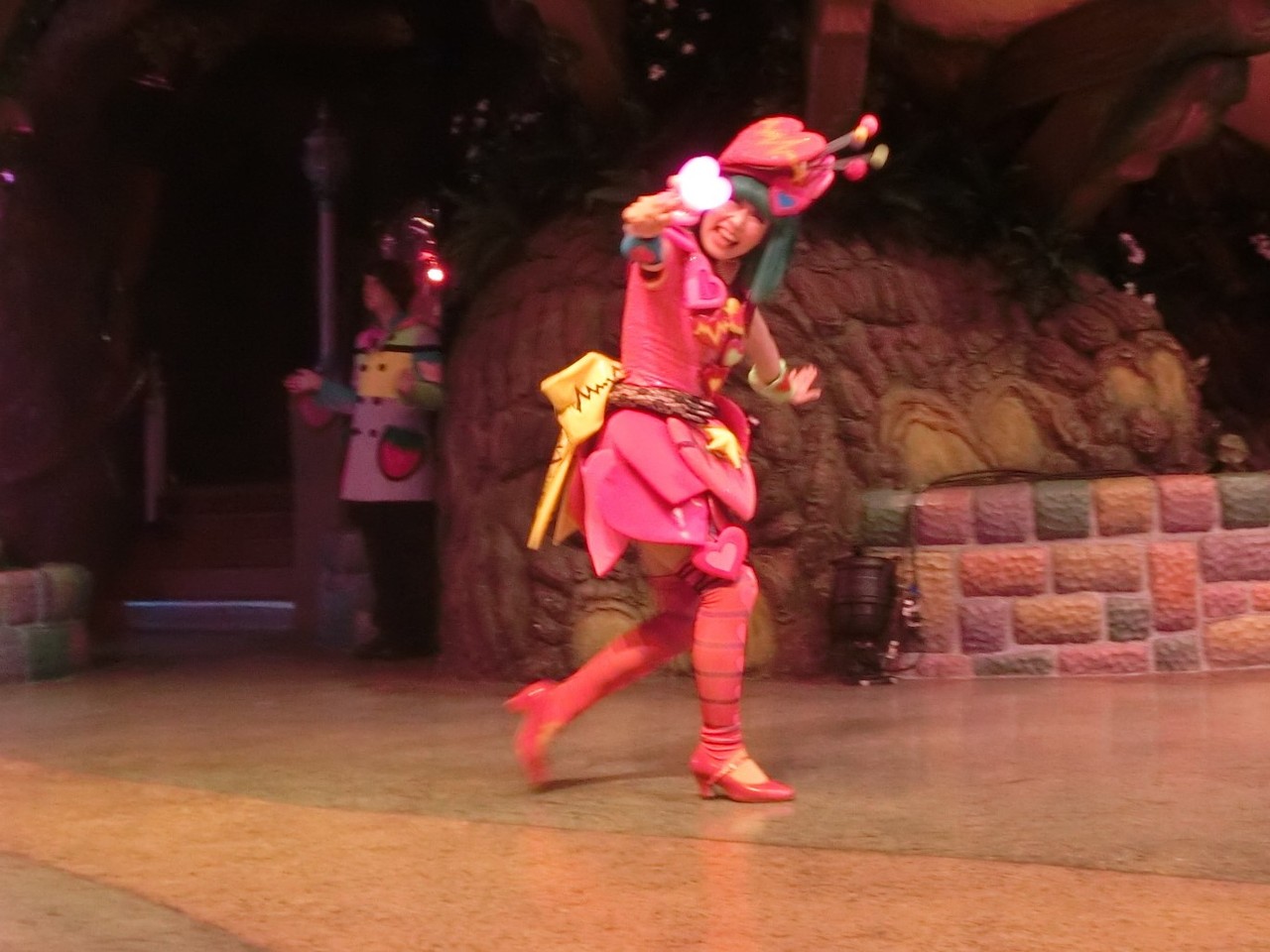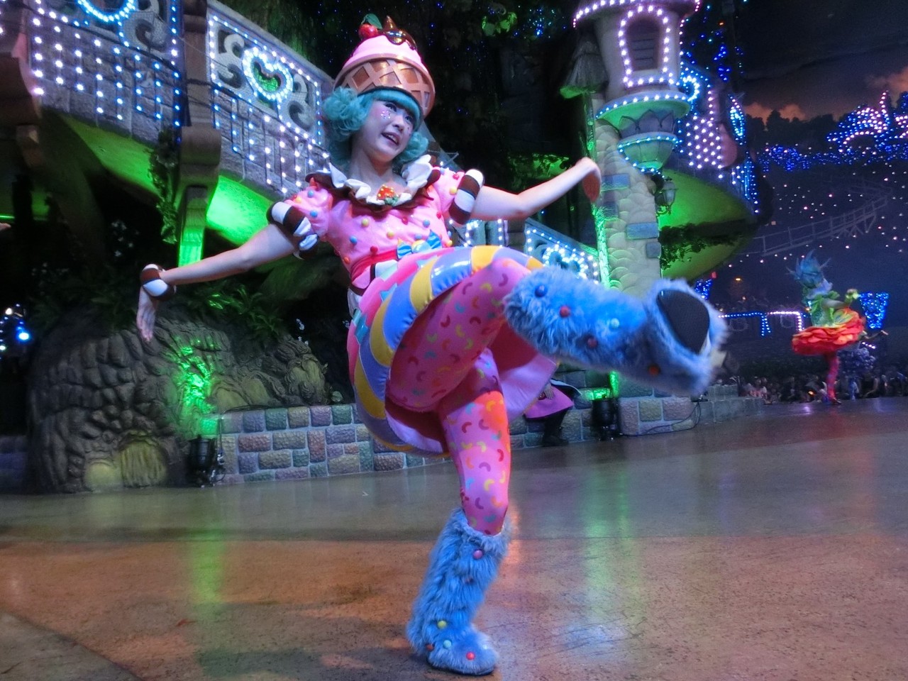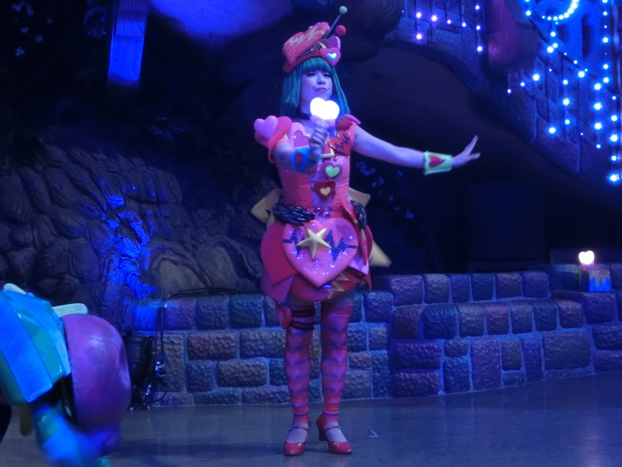 一旦お昼を食べに外へ出て、帰ってきたのは13時30分過ぎ。ちょうどステージではメルのショーをやっていました。いつもはメルヘン劇場で「鬼さん」を演じている皆さんがパステルカラーのかわいい衣装でメルとショーを演じるのが見ものです。
