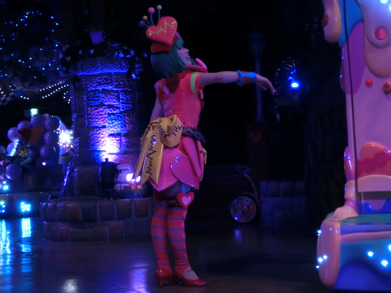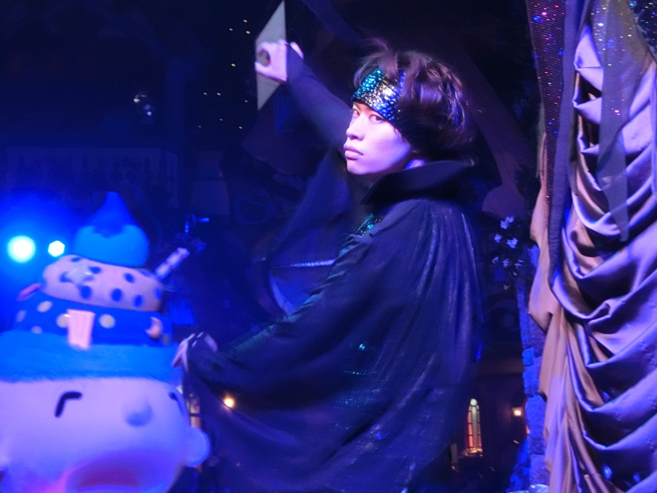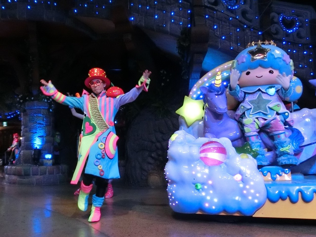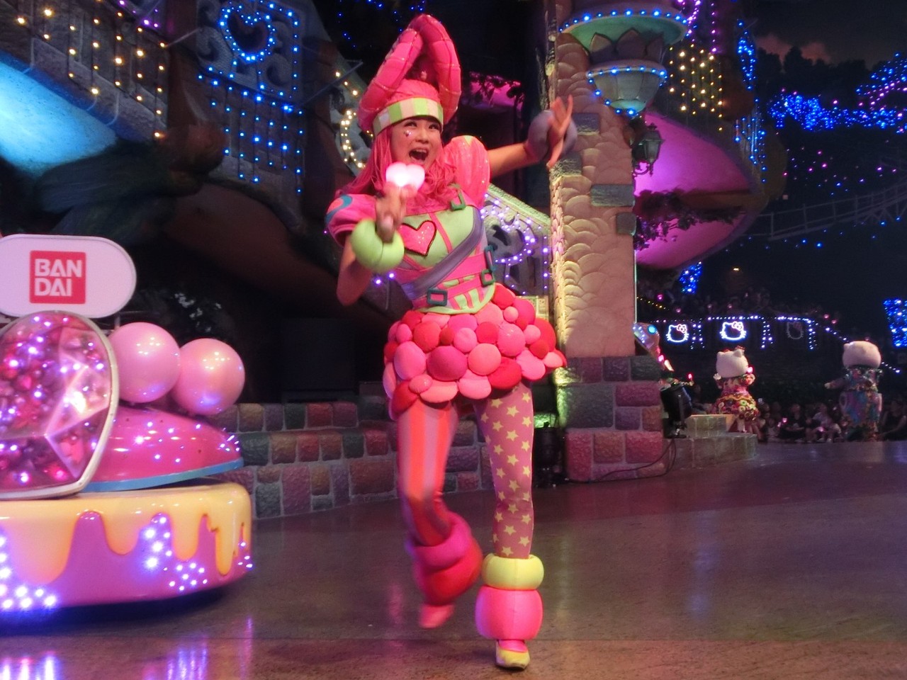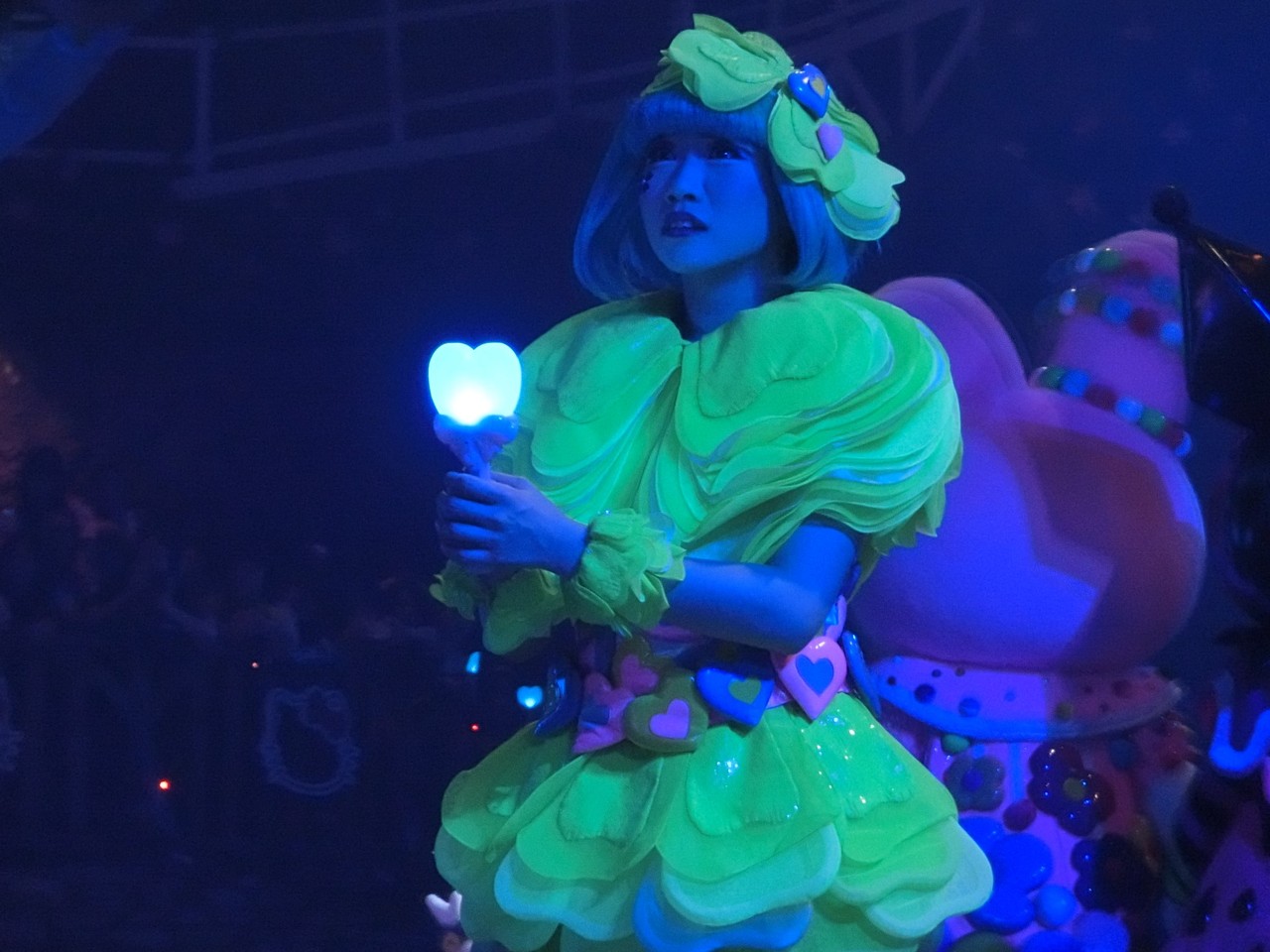 一旦お昼を食べに外へ出て、帰ってきたのは13時30分過ぎ。ちょうどステージではメルのショーをやっていました。いつもはメルヘン劇場で「鬼さん」を演じている皆さんがパステルカラーのかわいい衣装でメルとショーを演じるのが見ものです。