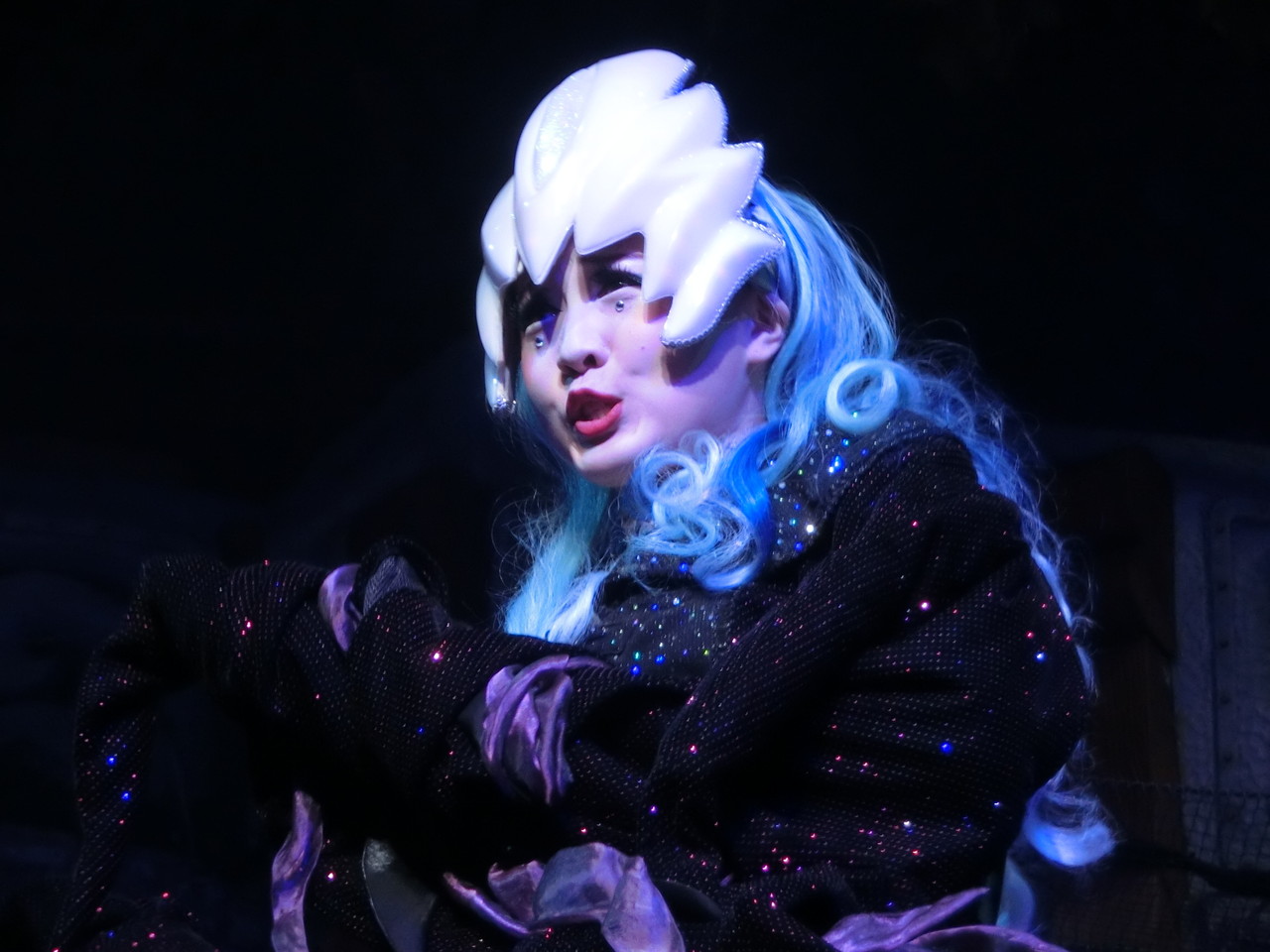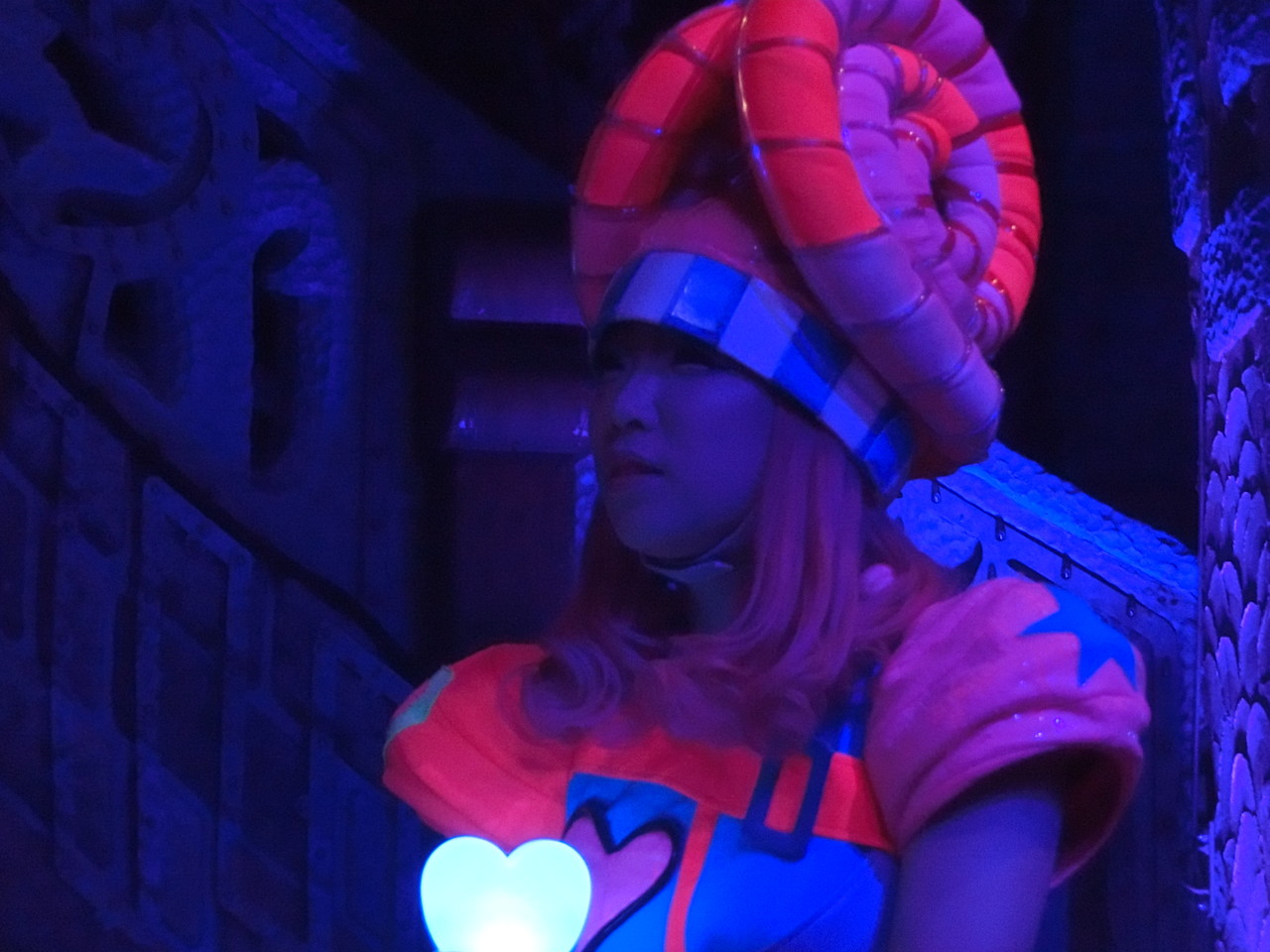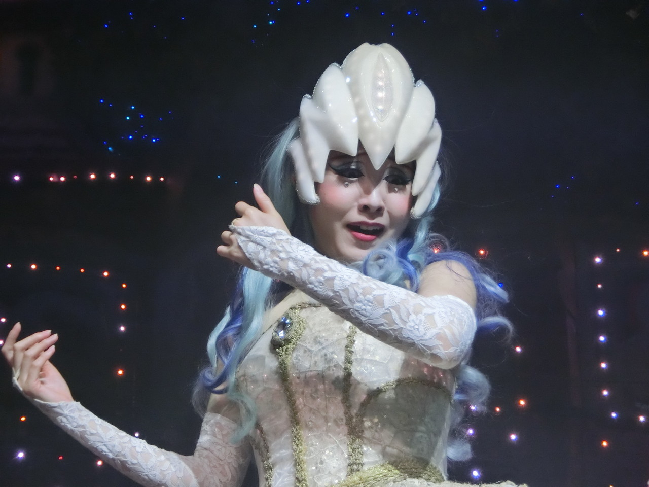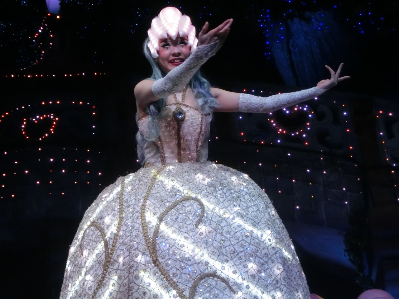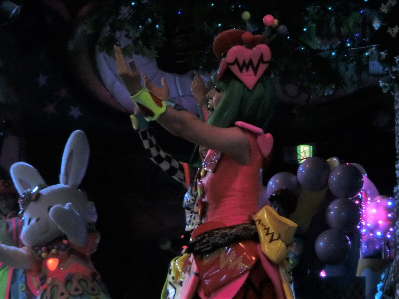 一旦お昼を食べに外へ出て、帰ってきたのは13時30分過ぎ。ちょうどステージではメルのショーをやっていました。いつもはメルヘン劇場で「鬼さん」を演じている皆さんがパステルカラーのかわいい衣装でメルとショーを演じるのが見ものです。