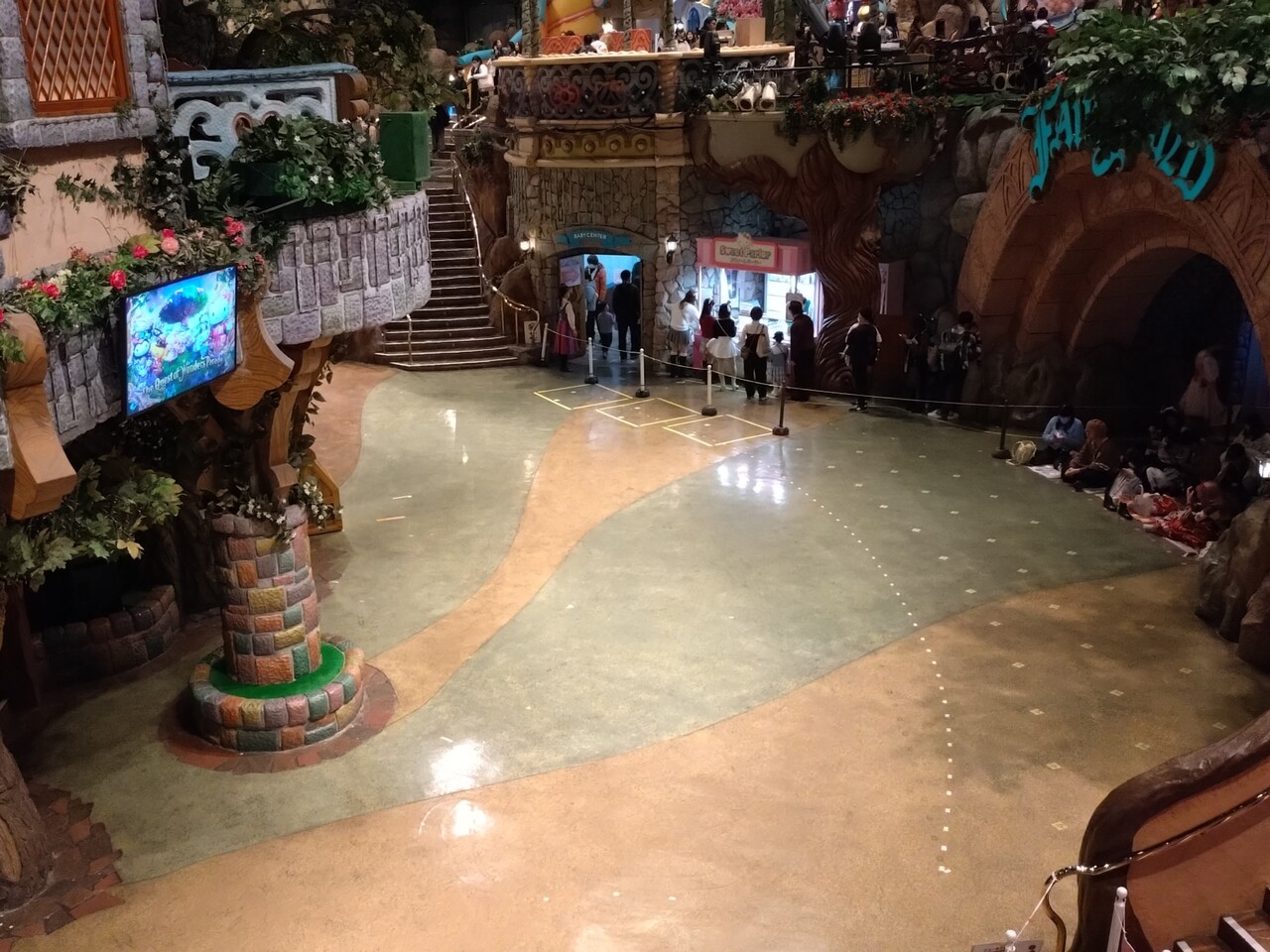 さて、クエワンですが、2階をウロウロさがしてみたらここ、ボートライドの写真売り場前がぽっかり一人分だけ空いていたのでそこにもぐりこませていただきました。