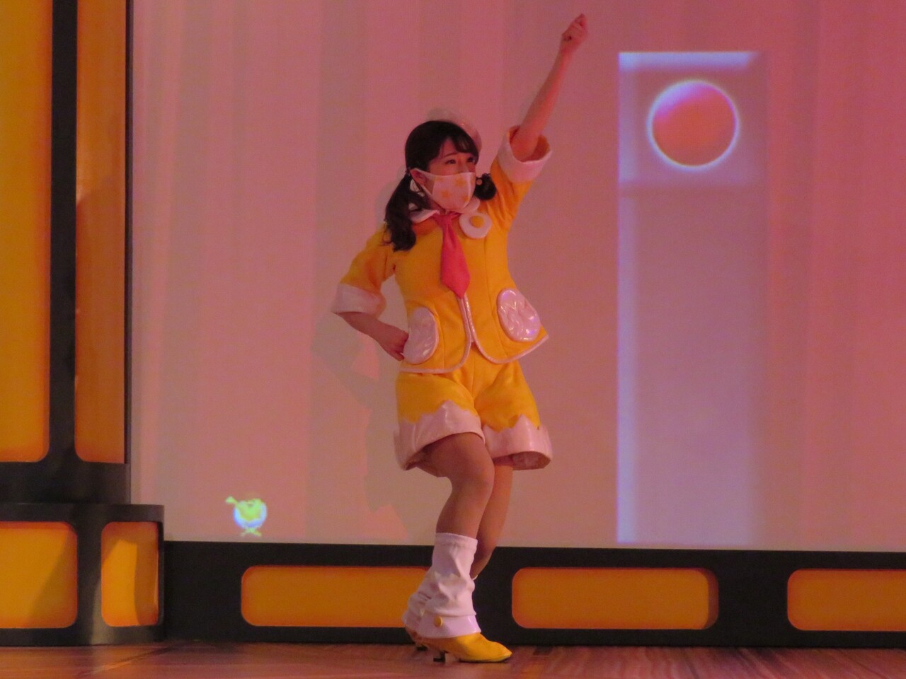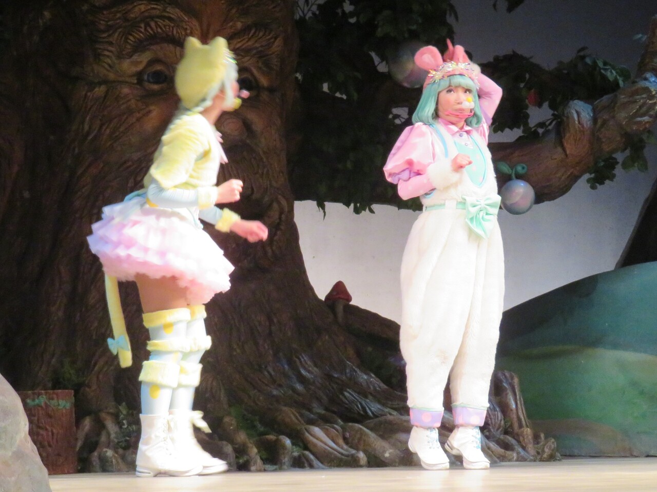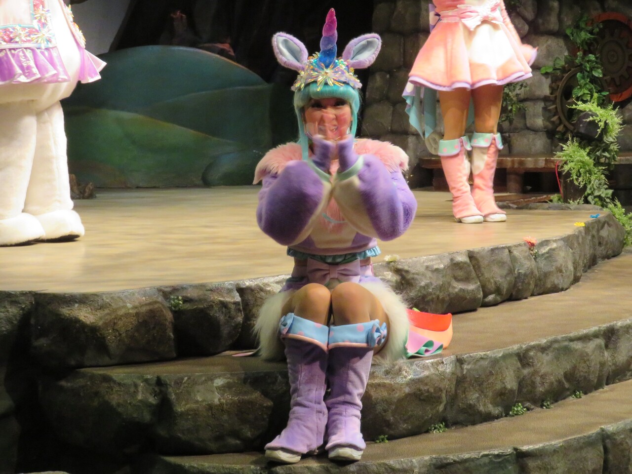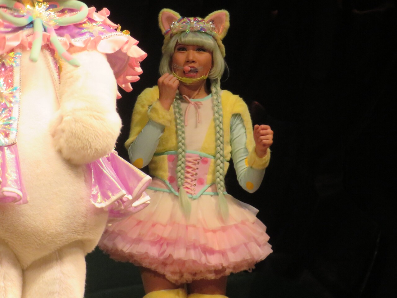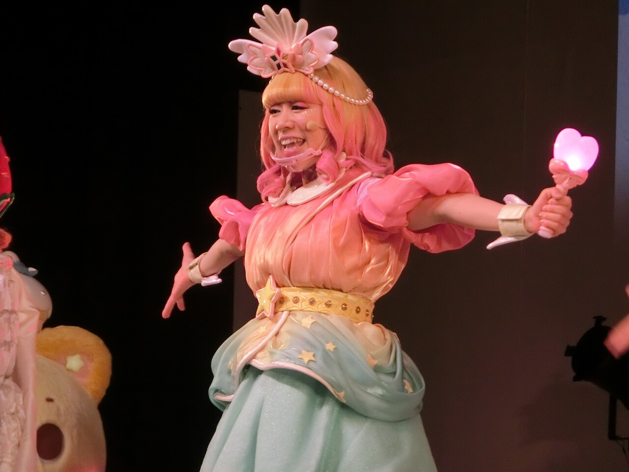 そしてシェネちゃんは、リサちゃん(清水リサちゃん)です。先月までは、シェネちゃんはあいちゃん(小林愛ちゃん)が演じていました。愛ちゃんは5月いっぱいでピューロD☆Eのメンバー一覧からもいなくなっており、2チーム掛け持ちでリサちゃんが代役となったのでしょう。